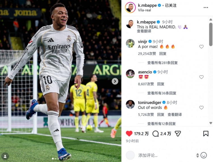 本场比赛姆巴佩梅开二度,其中包括一粒勺子点球。赛后姆巴佩也在社媒晒出本场庆祝进球照片,配文写道:“这就是皇马!”