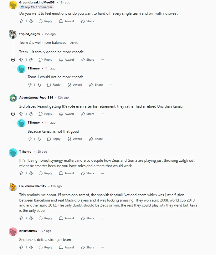 我偏向2队。我觉得看这种混搭阵容比看那套我们已经见过无数次的ZOFGK更有趣。T1 x GEN x Viper听起来就很带劲。特别想看到Viper/Keria走下路,他们两个都是那种顶级“操作怪”。